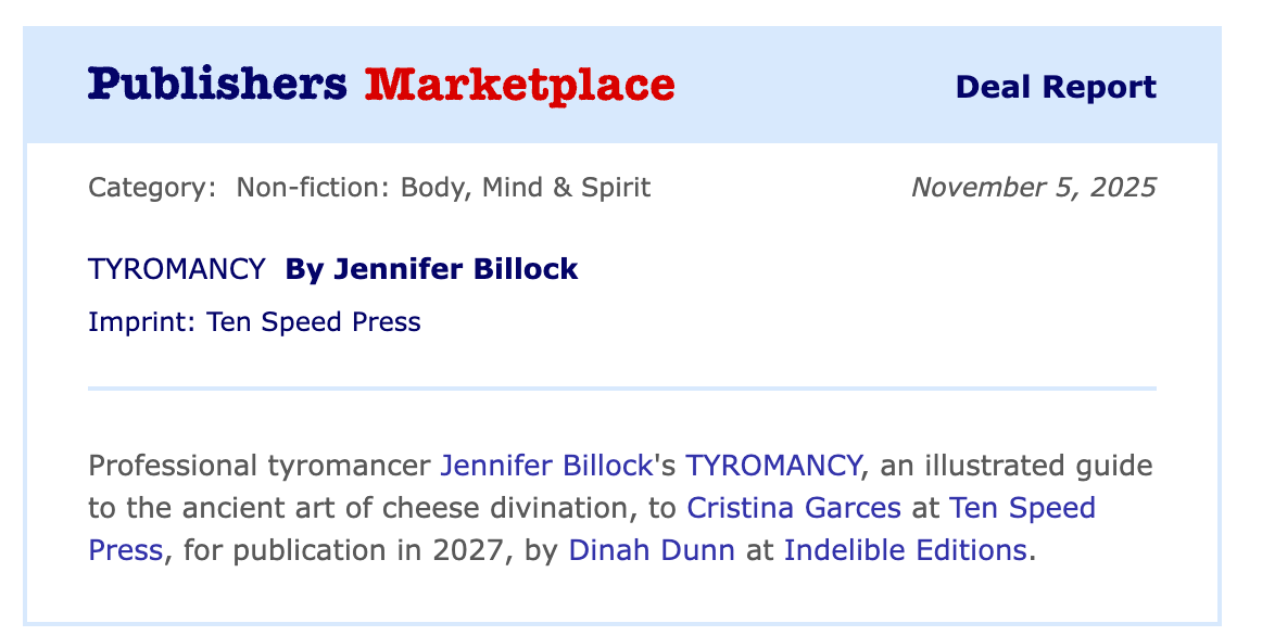 A short but meaningful post today, as I can officially announce that I’ve signed a contract to write Tyromancy, a book about cheese fortune telling, with Ten Speed Press. It’ll be out in 2027 and I cannot wait!